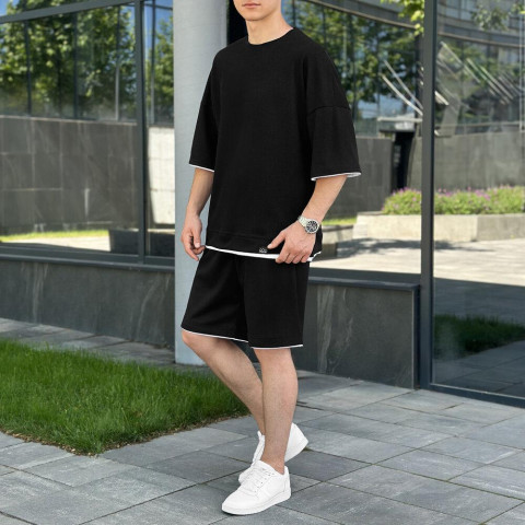 Шорти мають пояс на резинці зі шнурком, що дозволяє легко регулювати їх посадку за розміром і забезпечує комфортну фіксацію на талії. Дві бокові кишені додають функціональності, дозволяючи зберігати дрібниці, такі як ключі або телефон, - завжди під рукою. Окантовка низу шортів з куліра відповідає дизайну футболки, створюючи гармонійний вигляд комплекту.