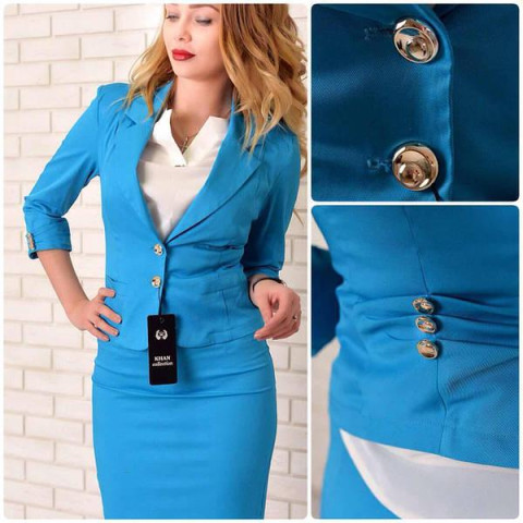 Жакет жіночий з якісної дорогої тканини Еріка (стрейчевий коттон) і рукавом 3/4. Піджак прикрашений трьома золотими ґудзиками на рукавах і на спині . Застібається на два гудзики. Новинка сезону осінь 2017 - весна 2018 – оригінальний і жіночний піджак з бавовни з еластаном і золотою фурнітурою. Костюмна «Еріка» - це бавовняна тканина, яка створюється за технологією, схожою з габардиновой. Нитки з бавовни з домішкою невеликої кількості синтетики, переплітаються по діагоналі, утворюючи міцну і еластичну матерію середньої щільності. Ця матерія відрізняється гладкою і шовковистою поверхнею. Вона добре драпірується і без праці тримає форму, не мнучись із-за присутності в складі поліестеру. Еластан надає еластичність тканини, достатню для того, щоб тягнутися в одну сторону і повертатися до первісної форми. Еріка володіє такими властивостями: за рахунок бавовни тканина гігієнічна та дихаюча; особливу переплетення ниток надає міцність, зносостійкість і слабкі водовідштовхувальні властивості; практично не мнеться. Розміри: 42, 44, 46, 48 Кольори: корал, молочний, білий, яблуко, електрик, бірюза