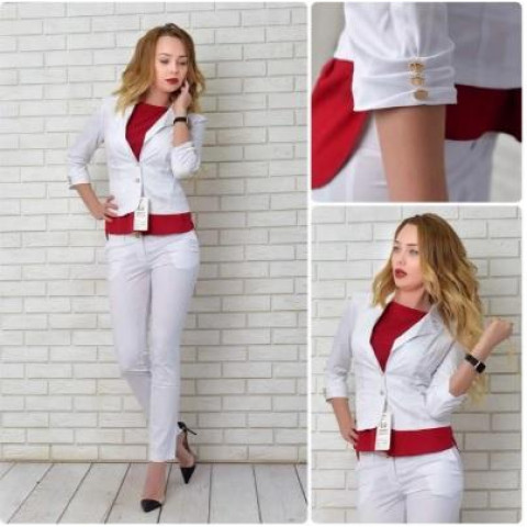 Жакет жіночий з якісної дорогої тканини Еріка (стрейчевий коттон) і рукавом 3/4. Піджак прикрашений трьома золотими ґудзиками на рукавах і на спині . Застібається на два гудзики. Новинка сезону осінь 2017 - весна 2018 – оригінальний і жіночний піджак з бавовни з еластаном і золотою фурнітурою. Костюмна «Еріка» - це бавовняна тканина, яка створюється за технологією, схожою з габардиновой. Нитки з бавовни з домішкою невеликої кількості синтетики, переплітаються по діагоналі, утворюючи міцну і еластичну матерію середньої щільності. Ця матерія відрізняється гладкою і шовковистою поверхнею. Вона добре драпірується і без праці тримає форму, не мнучись із-за присутності в складі поліестеру. Еластан надає еластичність тканини, достатню для того, щоб тягнутися в одну сторону і повертатися до первісної форми. Еріка володіє такими властивостями: за рахунок бавовни тканина гігієнічна та дихаюча; особливу переплетення ниток надає міцність, зносостійкість і слабкі водовідштовхувальні властивості; практично не мнеться. Розміри: 42, 44, 46, 48 Кольори: корал, молочний, білий, яблуко, електрик, бірюза
