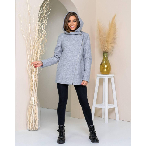 Коротке жіноче кашемірове пальто з капюшоном і з асиметричною блискавкою. Красиве та стильне пальто сезон весна — осінь на підкладці.