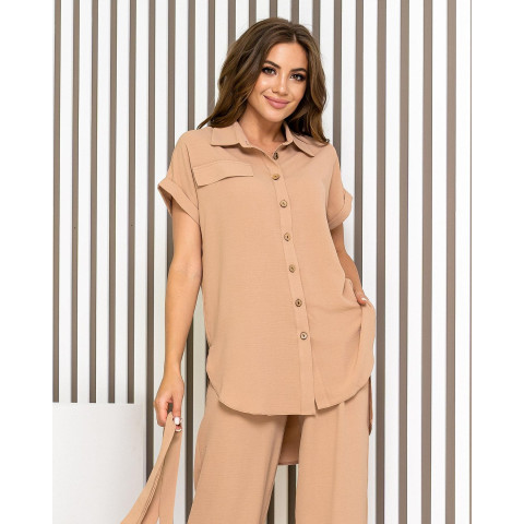 Легкий та стильний жіночий костюм у різноманітних кольорах — ідеальний вибір для повсякденного комфорту. Складається з подовженої блузи на гудзиках з коротким рукавом та брюк прямого крою. Верх блузи можна носити з поясом або без.