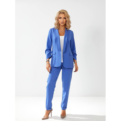 Елегантний жіночий костюм у насиченому відтінку — ідеальний вибір для офісу, ділових зустрічей чи стильного повсякденного образу. Комплект складається з подовженого жакета з лацканами та прямими брюками з манжетами. Жакет має зручну посадку, рукави 7/8 із декоративними складками та накладні кишені. Брюки середньої посадки підкреслюють фігуру, а м’яка тканина дарує комфорт протягом усього дня.