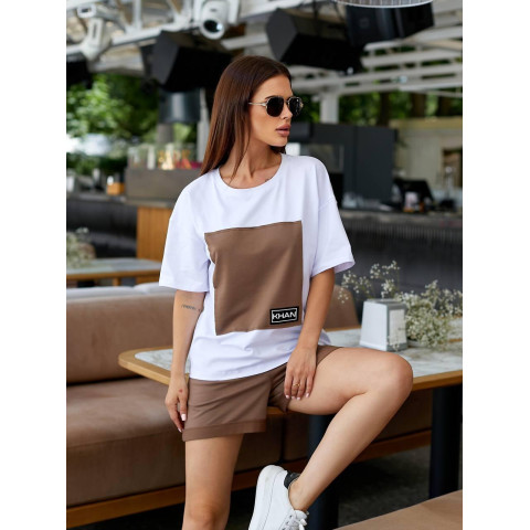 Стильний та зручний жіночий костюм ідеально підходить для теплої пори року. Складається з вільної футболки білого кольору з модною вставкою відтінку та шортів у тон. Оригінальний дизайн з контрастною вставкою на футболці та нашивкою з логотипом додає образу сучасності та енергійності.