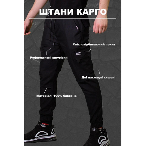 Штани карго котонові чорні чоловічі Without з накладеними кишенями з світловідбиваючим принтом