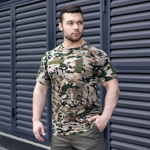 Чудова базова футболка на кожен день. Матеріал: 95% бавовна/5% спандекс. Європейський трикотаж високої якості, через наявність відсотка стрейчу у складі тканини дозволяє виробу зберігати початкову форму довгий час. На грудях та рукавах передбачено панелі велкро для кріплення шевронів та відзнак. В комплекті до футболки йде один шеврон - прапор України.