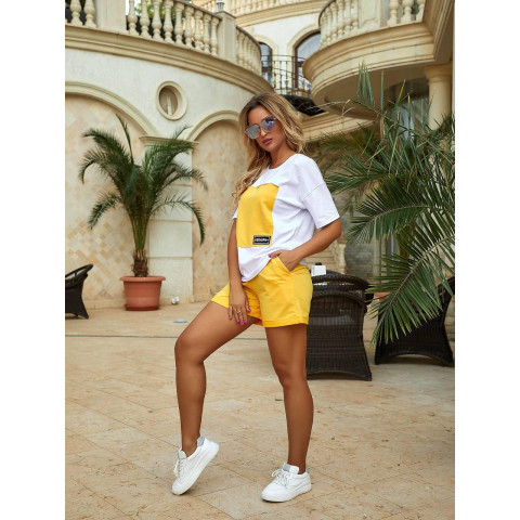 Стильний та зручний жіночий костюм ідеально підходить для теплої пори року. Складається з вільної футболки білого кольору з модною вставкою відтінку та шортів у тон. Оригінальний дизайн з контрастною вставкою на футболці та нашивкою з логотипом додає образу сучасності та енергійності.